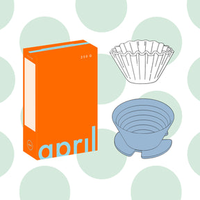 Included is an April Plastic Brewer, 1 pack of 50 April Filter Papers (Large) and a 250g box of April Filter Coffee (chosen at random, roast date never larger than 7 weeks ago).